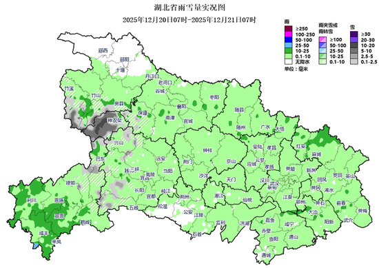 昨日(20日)受冷空氣影響,全省出現(xiàn)小雨到中雨、恩施局地大雨,鄂西半高山以上地區(qū)出現(xiàn)雨夾雪或雪,其中十堰南部和神農(nóng)架1000米以上高山區(qū)中到大雪、局地暴雪。