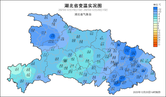 雨水大風(fēng)加持下,氣溫降幅明顯。大部地區(qū)最高氣溫9~16℃,最低氣溫1~7℃(鄂西高山區(qū)-3~0℃),過去24小時平均氣溫下降4~8℃,鄂西北和鄂東部分地區(qū)最高氣溫降幅超10℃。