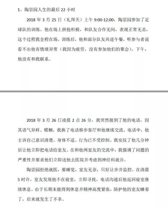 3月31日,一篇寫于3月28日,署名為王攀的文章公布,該文稱,“作為陶崇園本科班主任、本科生導(dǎo)師、研究生導(dǎo)師,(自以為)和他感情極深者”,寫一小文記述兩人往事。該文談及曾在25日與陶崇園同場踢球,無異常。26日凌晨2時26分,陶崇園給王攀打來電話,自稱身體不適、行為不受控制。后仍發(fā)生不幸。