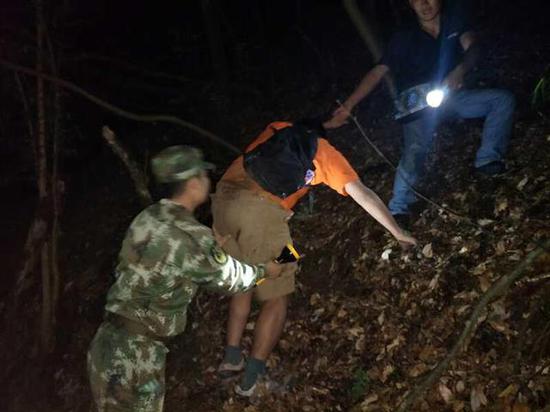 在救援人員的鼓勁攙扶下,年輕人慢慢站起來。救援人員通過安全繩,慢慢接力,一個在前一個在后,扶持著被困者,通過電筒照明在陡峭的密林中穿行。凌晨3點07分,2名被困者終于脫離危險,被帶到安全區(qū)域。