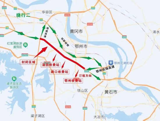 汀祖方向來(lái)車行駛武黃高速,由陳橋互通進(jìn)入鄂州機(jī)場(chǎng)高速,經(jīng)東廟互通繞行至武鄂高速往葛店、龔家?guī)X收費(fèi)站方向。