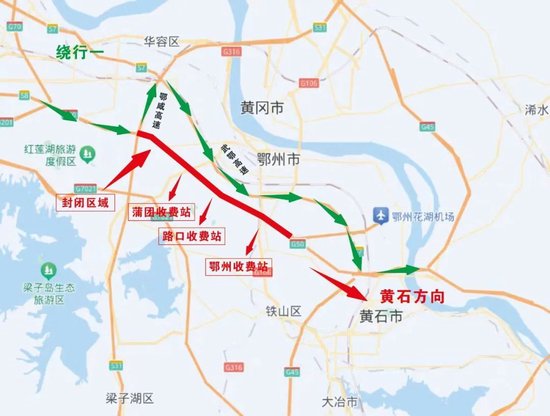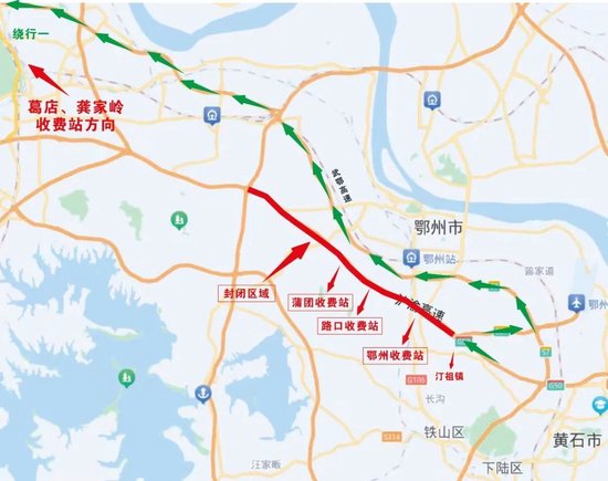 黃石方向來(lái)車由花湖互通繞行武鄂高速往葛店、龔家?guī)X收費(fèi)站方向。