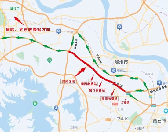東廟互通處,武鄂高速上鄂州機(jī)場(chǎng)高速往陳橋互通方向不可通行。