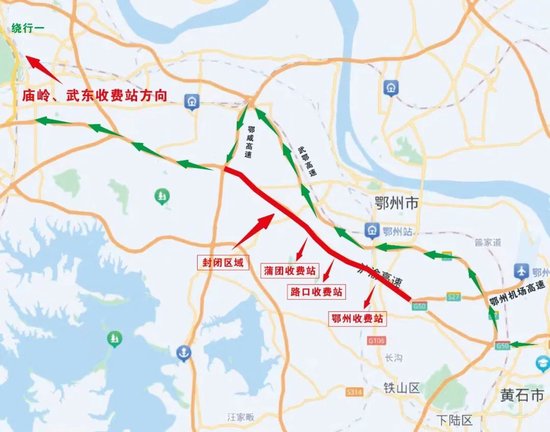 武黃高速鄂咸互通至陳橋互通主線雙向封閉,期間蒲團(tuán)、路口、鄂州收費(fèi)站關(guān)閉;鄂州機(jī)場(chǎng)高速東廟互通至陳橋互通方向主線封閉。