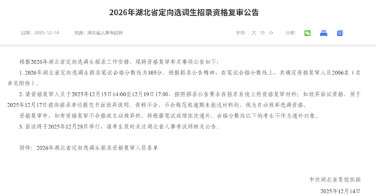 近日,湖北省委組織部發(fā)布《2026年湖北省定向選調(diào)生招錄資格復(fù)審公告》。