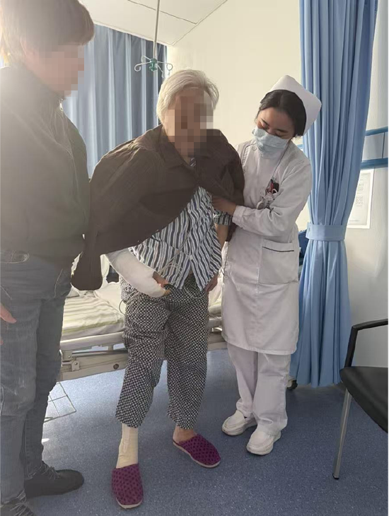 術(shù)后康復(fù)前移,打破臥床傳統(tǒng)桎梏。 科室將康復(fù)起點大幅提前:術(shù)后立即啟動多模式鎮(zhèn)痛,有效控制疼痛;醫(yī)護人員在術(shù)后第一天即協(xié)助并指導(dǎo)患者進行床邊坐立、輔助下站立及短距離行走;同步開展患肢關(guān)節(jié)主動與被動活動、肌肉力量訓(xùn)練,并配合專業(yè)的營養(yǎng)支持和精心護理。這一系列舉措,有效規(guī)避了高齡患者長期臥床可能引發(fā)的墜積性肺炎、深靜脈血栓、肌肉萎縮等嚴(yán)重并發(fā)癥,為快速功能恢復(fù)奠定了堅實基礎(chǔ)。