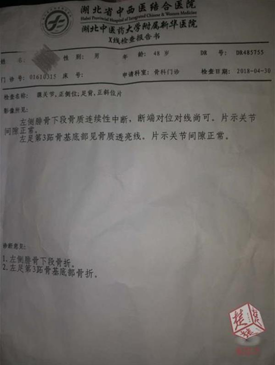 然而,事發(fā)后第二天,羅先生起床時感覺左腿疼痛難忍,他趕緊到醫(yī)院做了檢查,才發(fā)現(xiàn)自己的左腿骨折了。通過羅先生提供的診斷報告,楚天都市報記者看到,羅先生的左腿確實出現(xiàn)兩處骨折。