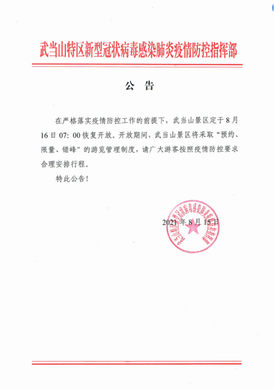 在嚴格落實疫情防控工作的前提下,武當山景區(qū)定于8月16 日07: 00恢復開放。開放期間,武當山景區(qū)將采取“預約、限量、錯峰”的游覽管理制度,請廣大游客按照疫情防控要求合理安排行程。為了您的身體健康,特別向您作如下提示: