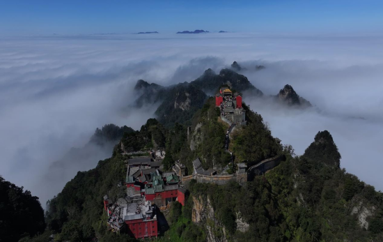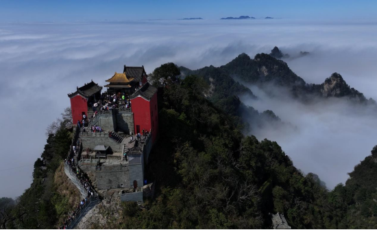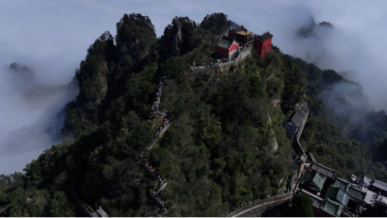“十一”黃金周期間,武當山大部分時間被陰雨籠罩,給游客行程帶來些許遺憾。10月7日,盡管山路上依然是細雨綿綿,但是登上天柱峰卻驚喜降臨。當游客們乘坐纜車穿破云層時,眼前的景象豁然開朗。云層之上,天空湛藍,陽光燦爛,溫暖地灑在古老的宮殿和紅墻金頂之上,熠熠生輝。立于金頂,山間濃霧升騰,在群峰間翻涌流動,山峰與樹木籠罩其中,若隱若現(xiàn),如夢似幻。俯瞰腳下是奔騰的云海,仰望頭頂是湛藍的蒼穹,仿佛置身于天宮瓊樓,真正體驗到了“會當凌絕頂,一覽眾山小”的壯志豪情。