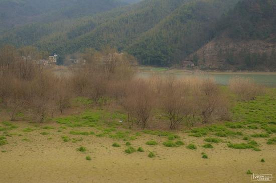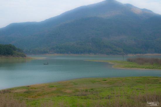 我們在壩頂上感嘆了許久許久,也凝望了許久許久,始終不敢相信就在我們的家鄉(xiāng)湖北竟隱藏著這樣一個絕世的山水妙境。很長時間才回過神來,遠遠地看見遠處的湖邊似乎有人撐船,于是我們決定再往前走走,看看有沒有能更臨近湖面的地方,好讓我們更加充分地領略青山湖的美。