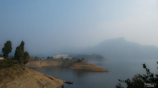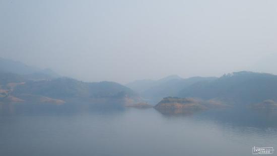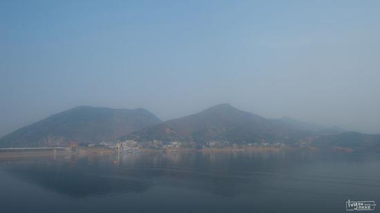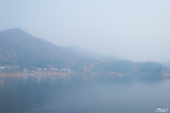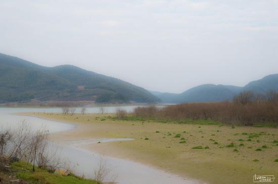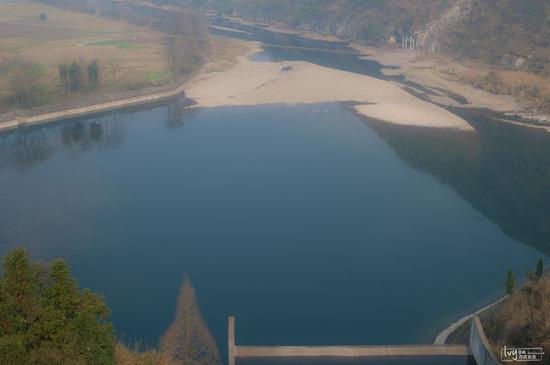 跟著導航一路開到了山腳下的村莊,遠遠地就看見山頂上有一排整齊的樹木,還有一個翹角飛檐的亭子——那應該就是水庫的大壩了,想到此心情不由得更加激動,一路飛馳上山,把車直接開到大壩上停下。迫不及待地拿起相機沖出車外,看到的是這樣壯闊的場景——站在壩頂俯瞰來的方向,山峰近在眼前,碧綠的河流蜿蜒在山腳下,快到大壩跟前時突然水面變得開闊。時值冬日,正是枯水季節(jié),河面露出了一部分淺灘,點綴在藍綠色的水面,就像隨意潑墨而成的一幅畫!