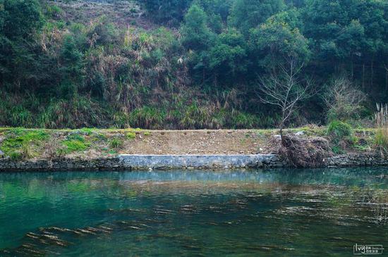 過了銅鼓繼續(xù)往前,左手邊有一條上山的路,沿著山路往前開,漸漸地就看見了大市河。河水碧綠而寧靜,順著山勢靜靜流淌。河中的水草隨著水流輕擺,搖曳生姿。