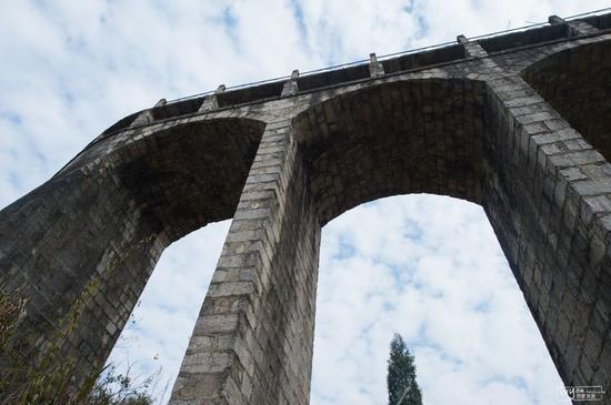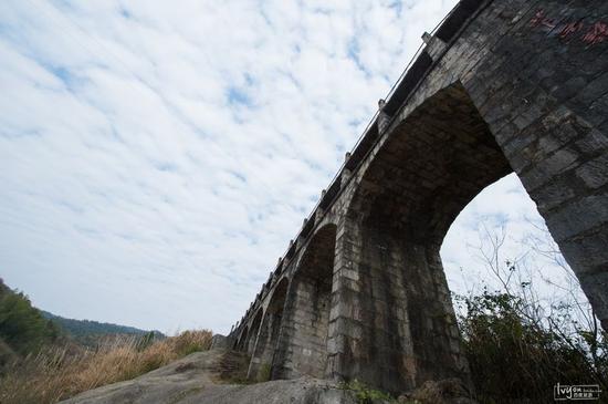 站在渡槽的頂端,方才清楚地看到了渡槽的真面目——其實真的就是用來引水的水槽,槽還是挺深的,沒敢下去,怕下去了上不來:)兩邊的欄桿由于年久失修早已銹跡斑斑,壯著膽子往前走了一小段。100多米的高度果然威力十足,往下看一眼不自覺地會腿軟,而且感覺這被歲月腐蝕的欄桿分分鐘會風化掉,所以及時打了退堂鼓,走了回來,沒能完成穿越渡槽的“壯舉”。