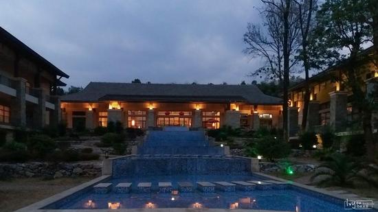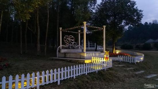 天色很快暗了下來,我們在房間稍作休息后,出門準備去吃晚餐。從我們住的3號樓出來,經(jīng)過一片竹林小徑,來到這一片寬闊的草坪。草坪上有不少的人造景觀,是為舉辦戶外婚禮而設置的。此刻沒有婚禮,暖黃的燈光已亮起,給這夜色平添了幾分溫馨。