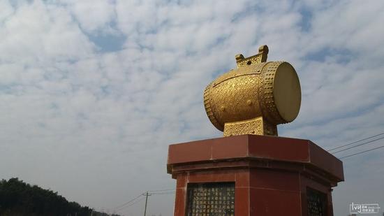 驅(qū)車跟著導航在山間田野穿行,不一會進入了一片村莊,遠遠地看見村子中心廣場上有一個金色的雕塑,底座上寫著“大市”兩個字,應該就是這里了。把車停在路邊,走近了看,原來這個雕塑是一面鼓,問了村子里的村民,才知道在1977年的時候,這里出土了一件商代的銅鼓,是迄今為止出土的時間最早、保存最完整的大型銅鼓,中國僅此一件!