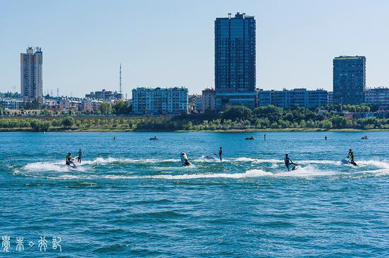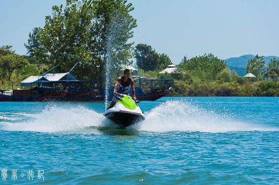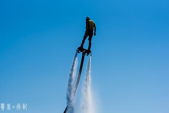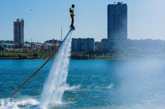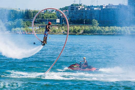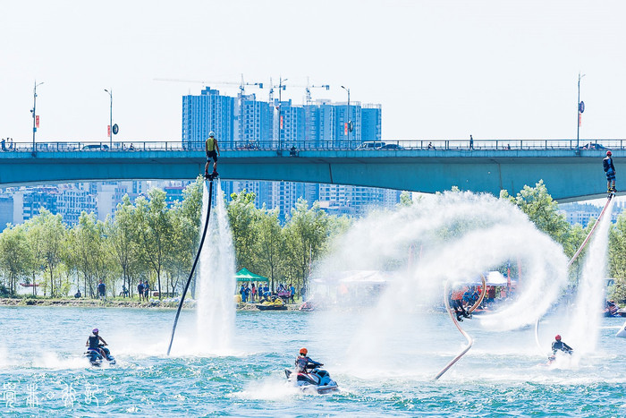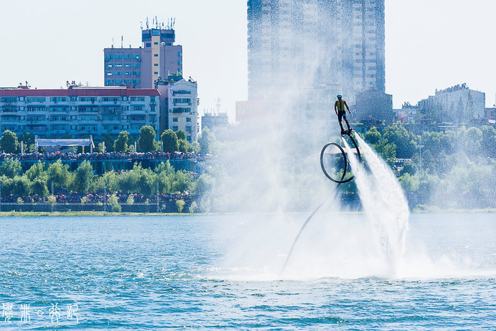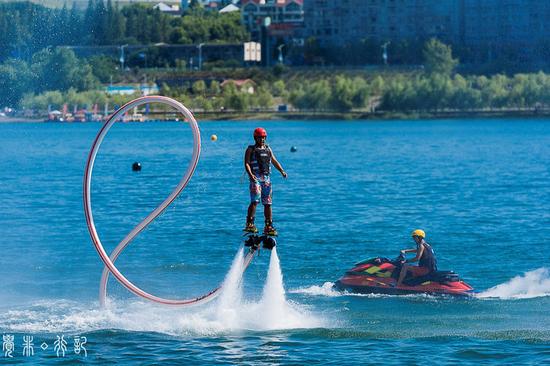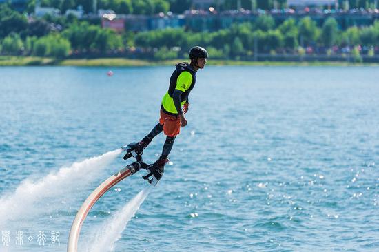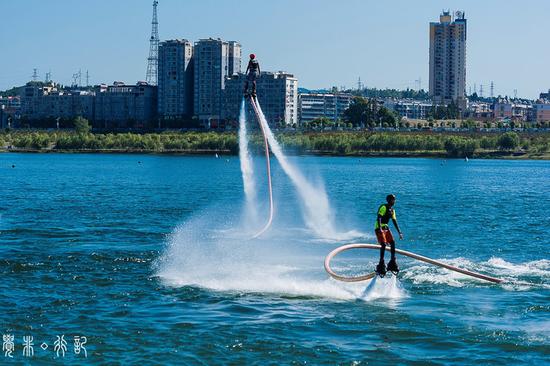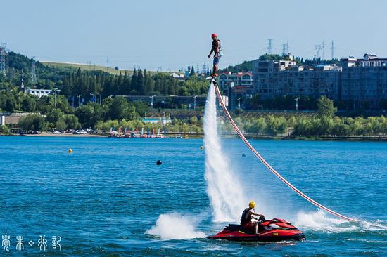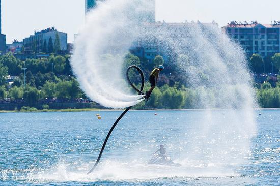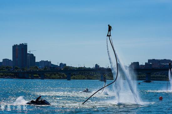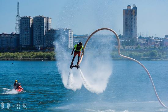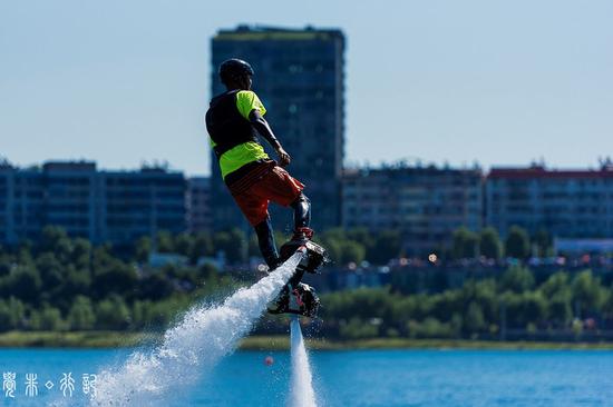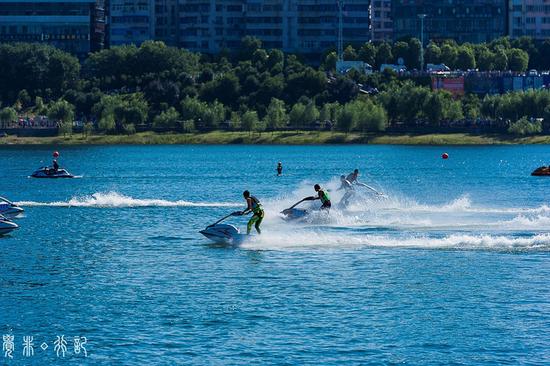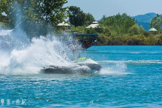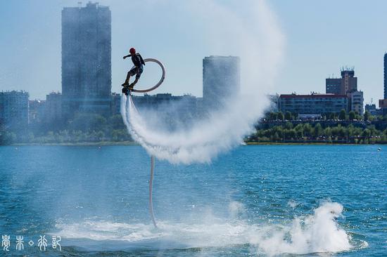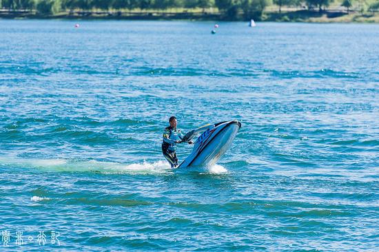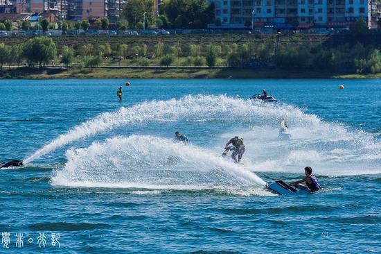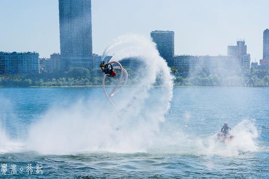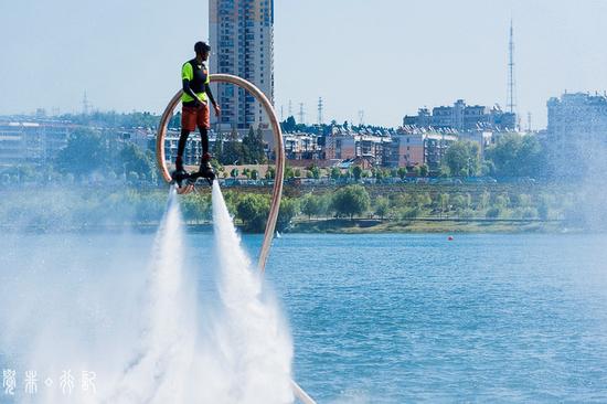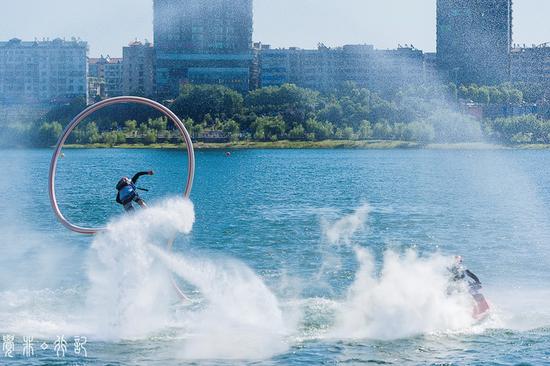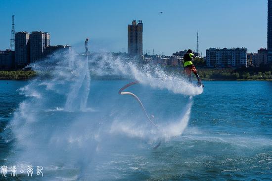 然而,當以為一個個運動員瀟灑亮相,擺出水上造型就結(jié)束時,才發(fā)現(xiàn),最精彩最刺激的水上超人已經(jīng)就位,不僅僅是在水中游,更是在水上飛?;匦?、跳躍、騰空,一個個花樣玩法點燃了丹江口的夏日激情。