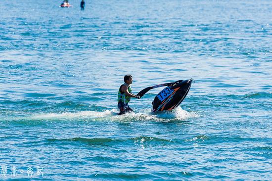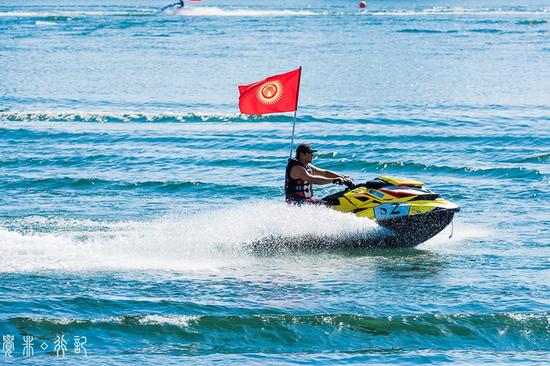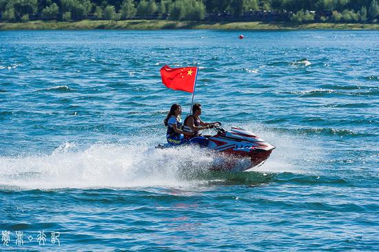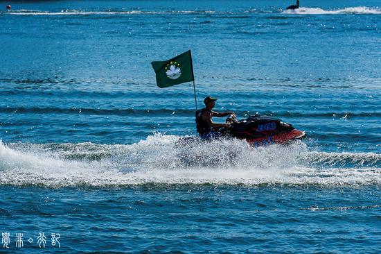 運動員出場,還只是出場的儀式,沒有拿出比賽的氣勢,浪花飛濺,便已驚艷了眾人。借助摩托艇,運動員變身為自由的魚,或群舞、或獨秀,變換著各種身姿,在水中暢游。