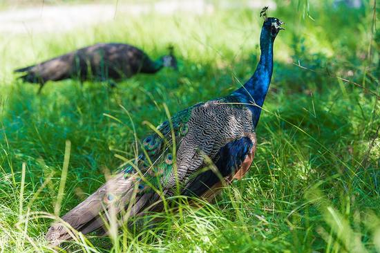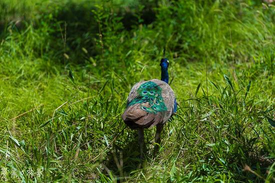 在水庫最深處,快艇停留在沙灘前方,換成竹筏劃向住滿了孔雀的對岸。那里沒有鐵絲網(wǎng),孔雀是島中的主人,看見我們一群人上來,便前來引路,而我們只是過客,在岸上遠遠的跟孔雀對視,眺望遠方的風景,然后,匆匆下島,乘著竹筏回到沙灘上。