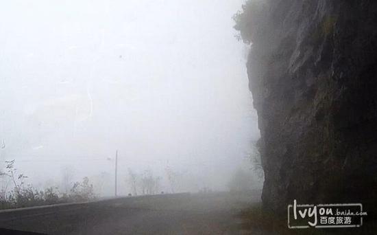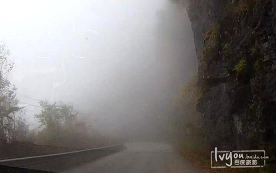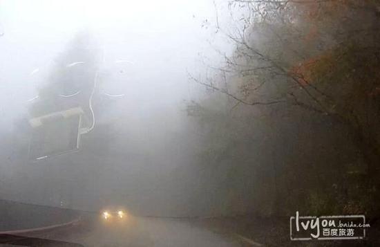 走著走著呢,突然發(fā)現(xiàn)對面的山梁上有霧,好美啊!可惜當(dāng)時沒能拍下來。再往前走,杯具了!山梁上的霧全都到路上來了!能見度不超過二十米!
