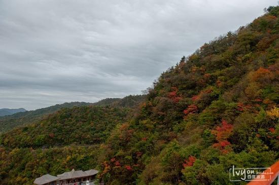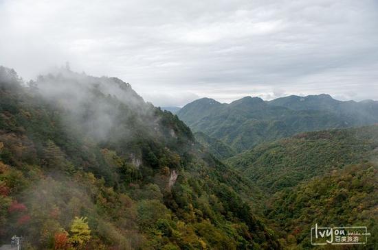 停車的這里風(fēng)光也很不錯了,抬頭就看到霧鎖山峰,夾雜一些紅的黃的葉子,還是有點味道。