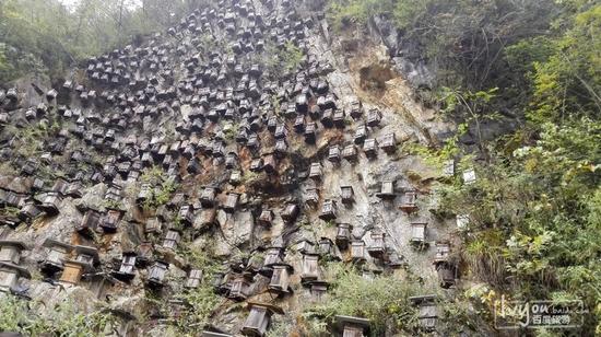 也是巧,奕爸這時候停車的地方正好有一個陡峭的巖壁,巖壁上滿是小箱子。奕爸猛然想起來,報紙上登過的,說神農(nóng)架有懸崖上的蜂房,還有照片,就是這里!要不是因為堵車,這個地方還真的錯過了呢!