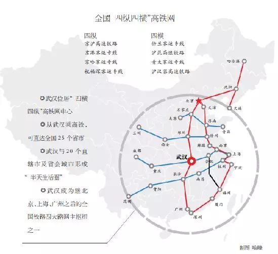 武漢作為”四橫四縱“高鐵網(wǎng)中心, 從武漢乘坐高鐵,能在8小時(shí)內(nèi)直達(dá)全國25個(gè)省市。 未來幾年的武漢,將打造“米”字型高鐵, 以后出門會更加便利。