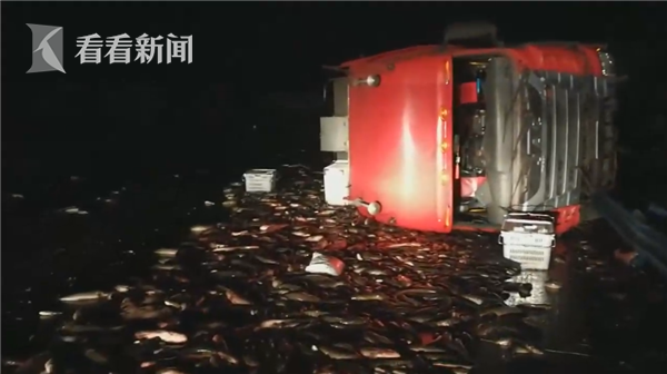 湖北省高警總隊宜昌大隊民警接警后趕到現(xiàn)場,發(fā)現(xiàn)一輛拖魚罐車側(cè)翻在高速公路邊、貨箱及所載的鮮魚撒落在路面,活蹦亂跳的魚兒占據(jù)了幾乎整個一側(cè)車道。